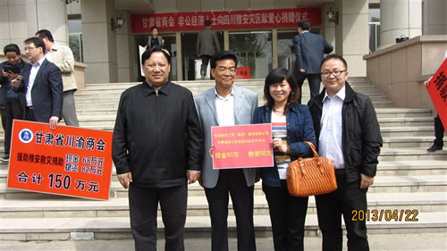 2013年4月22日下午15時(shí),在甘肅省政協(xié)一樓,由甘肅省委常委、省委統(tǒng)戰(zhàn)部部長(zhǎng)澤巴足,省委統(tǒng)戰(zhàn)部副部長(zhǎng)、甘肅省工商聯(lián)黨組書(shū)記、第一副主席吳繼德等相關(guān)領(lǐng)導(dǎo)出席了“甘肅省商會(huì)非公經(jīng)濟(jì)人士向四川雅安災(zāi)區(qū)獻(xiàn)愛(ài)心捐贈(zèng)儀式”。捐贈(zèng)現(xiàn)場(chǎng)眾多甘肅省非公企業(yè)向4月20日雅安市地震災(zāi)區(qū)進(jìn)行了捐贈(zèng),廣大愛(ài)心企業(yè)和人士用自己的實(shí)際行動(dòng)對(duì)災(zāi)區(qū)同胞奉獻(xiàn)了自己的真情和祝福。