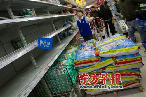 據(jù)上海市商務(wù)委有關(guān)人士透露,由于補(bǔ)貨及時(shí),昨天下午1時(shí)后全市各大超市、賣場(chǎng)相關(guān)貨架基本已恢復(fù)正常。
