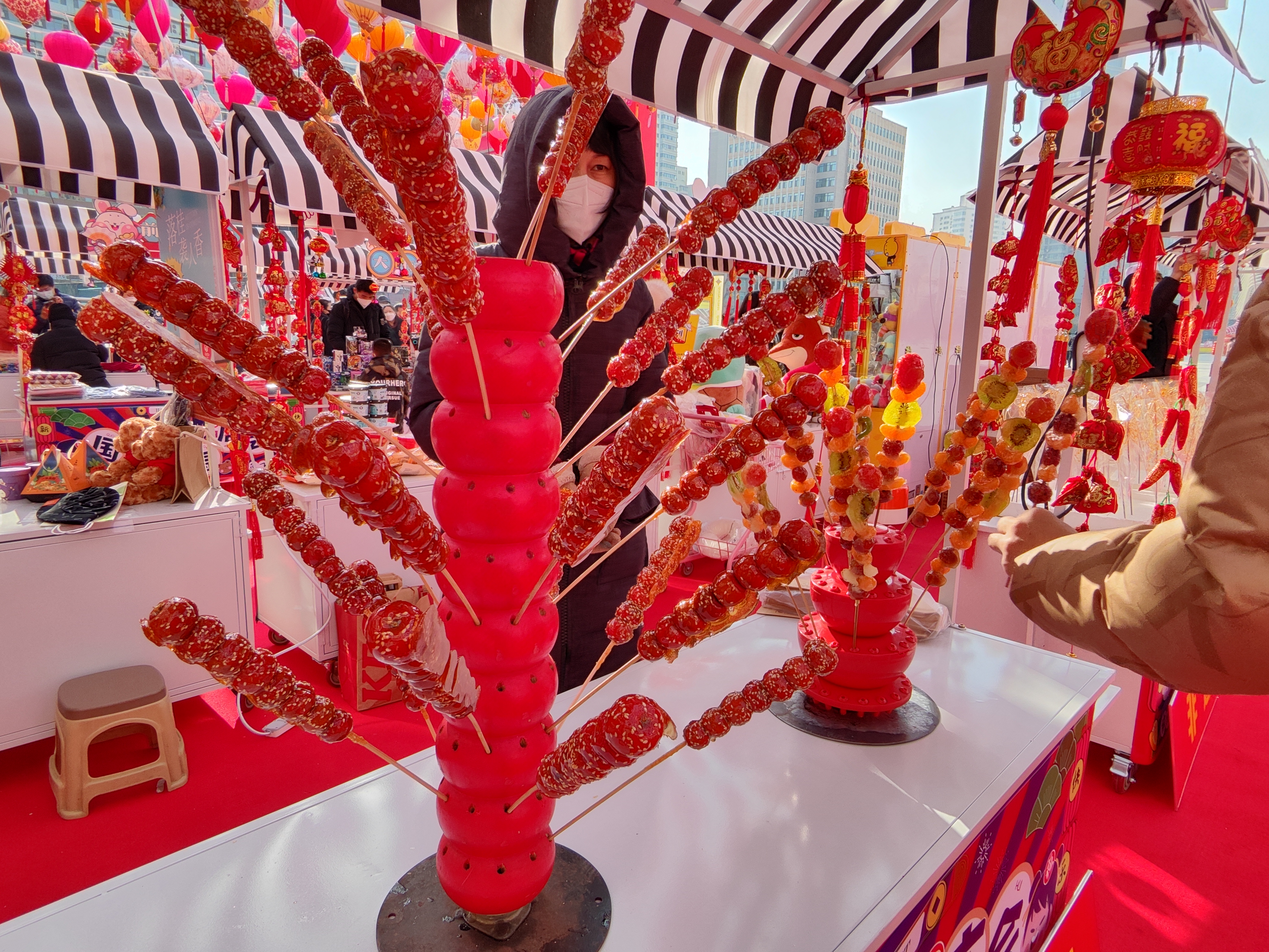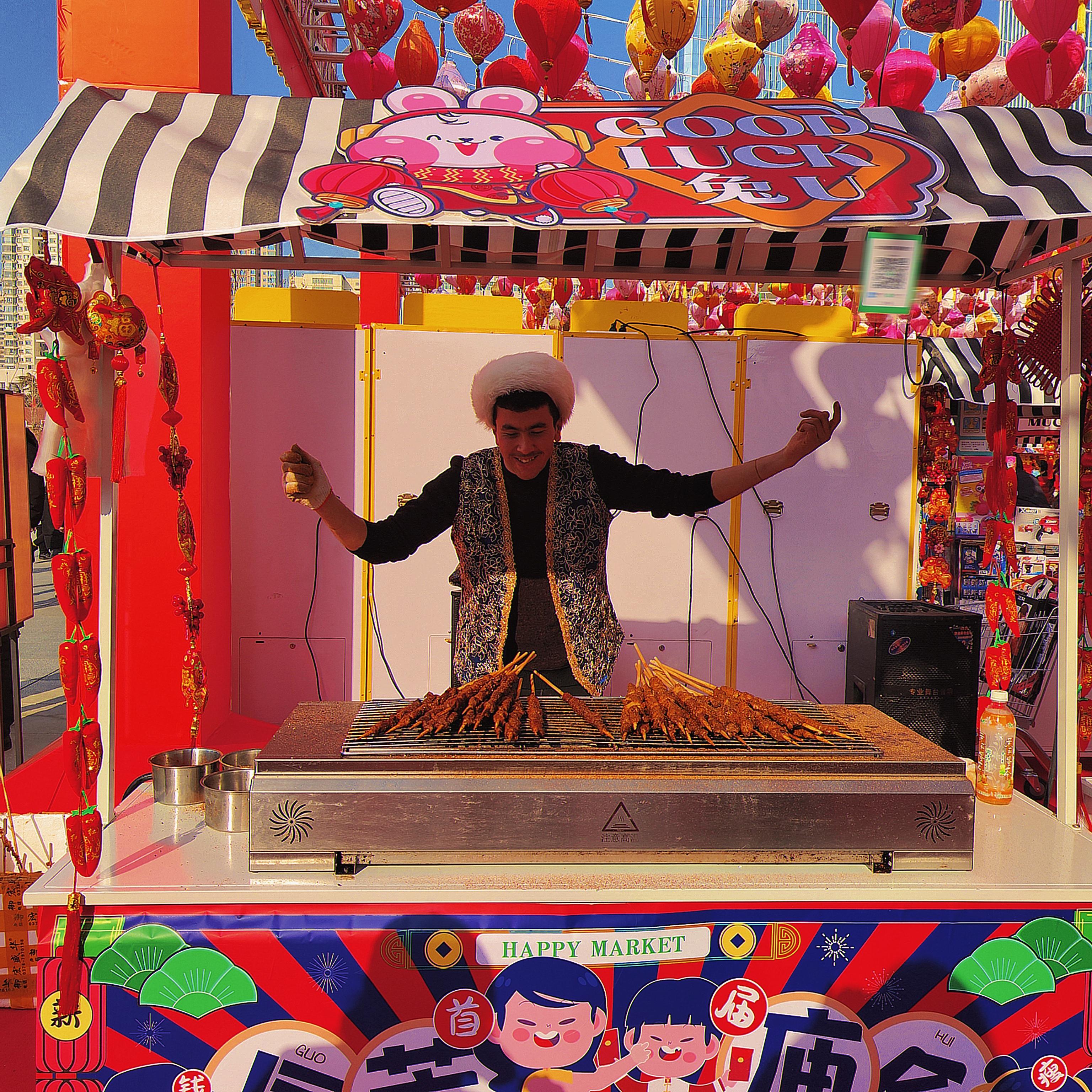 人間煙火處,年味漸濃時。新疆羊肉串、冰糖葫蘆、臭豆腐、酸辣粉、網紅大面筋,蘭州熱冬果……小吃攤生起騰騰熱氣,飄香十里。